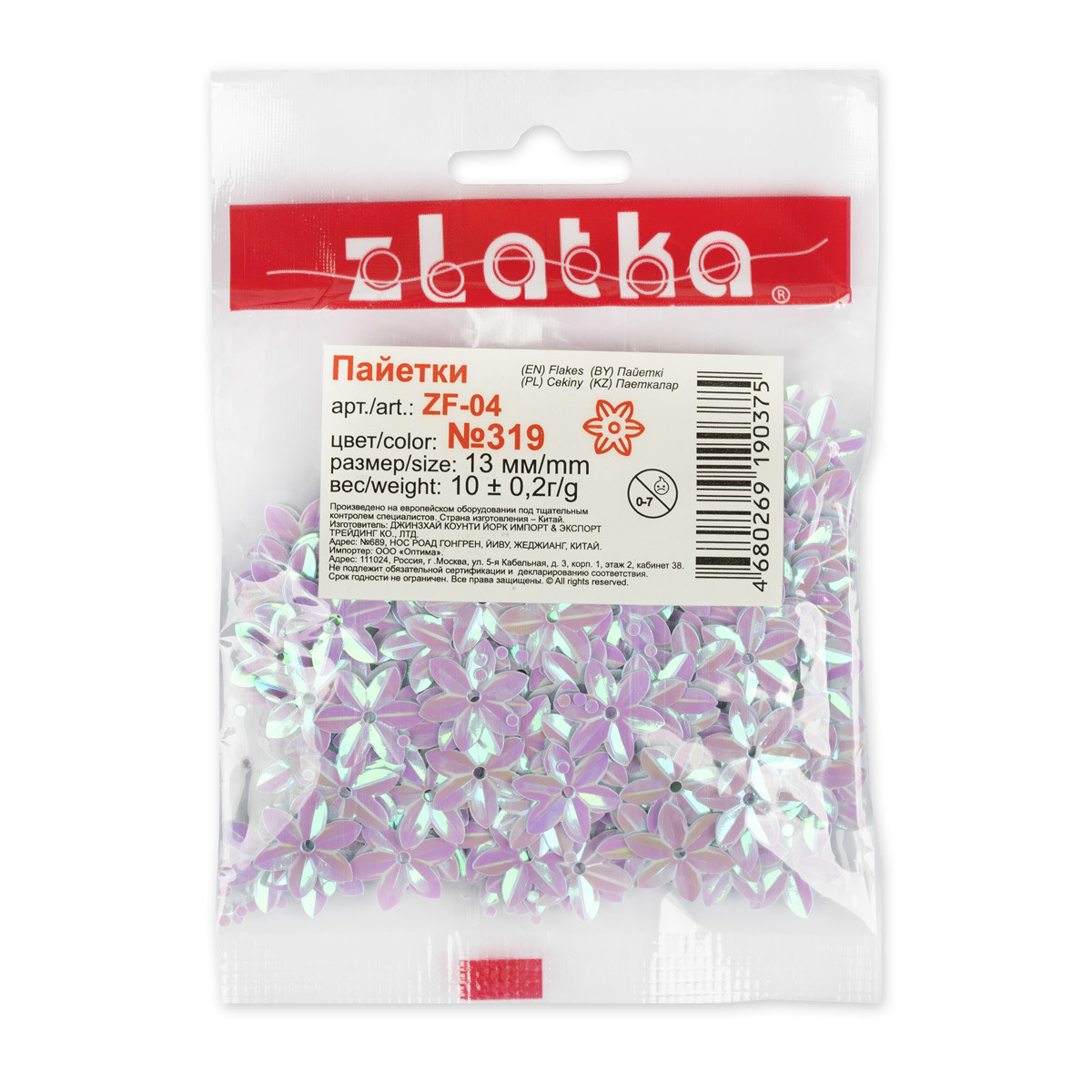 Пайетки россыпью " Zlatka" ZF- 04 в форме цветка с эффектом " перламутр". Пайетки используются как элемент украшения или дизайна одежды, обуви, сумок, кошельков и бижутерии, декоративной отделки интерьера, подарочных коробок, пакетов, букетов из цветов и пр. Подходят для использования в люневильской технике вышивания. Диаметр: 13ммПоверхность пайеток не рекомендуется гладить и подвергать механическому воздействию. Сообщить о неточности в описании